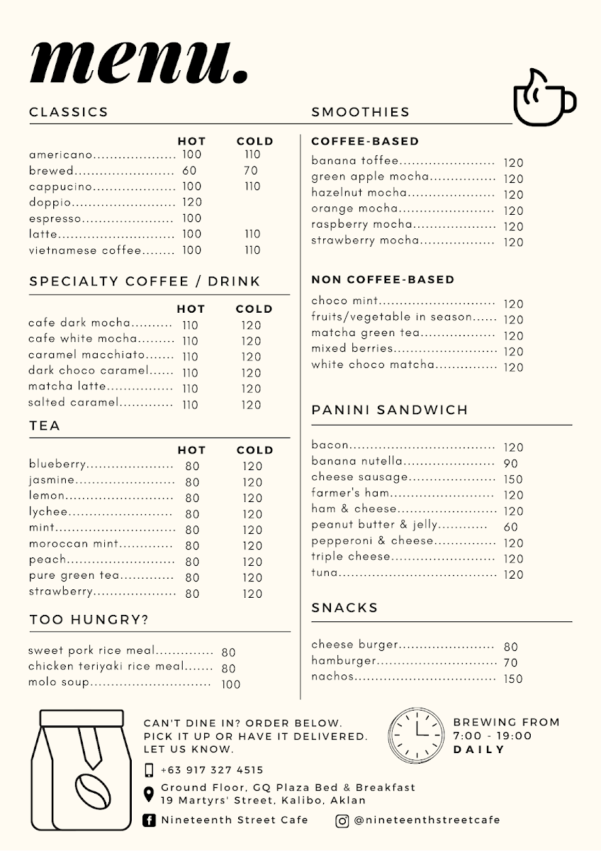 Welcome to Nineteenth Street Cafe, a cozy haven nestled in the heart of Kalibo, Aklan on Martyrs Street. This delightful cafe is the perfect spot for coffee aficionados and casual visitors alike, stretching its charm with a warm and inviting atmosphere that makes every visit feel like a special occasion.